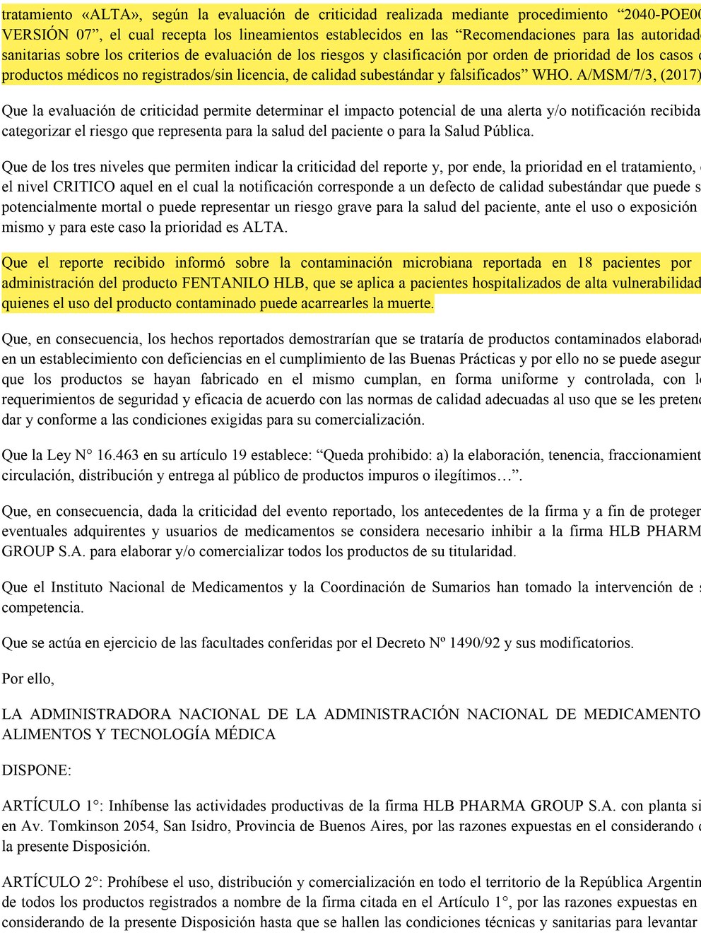 Entre los fundamentos de la ANMAT para cerrar la producción del laboratorio constan una serie de argumentos. Se destaca: “El reporte recibido informó sobre la contaminación microbiana reportada en 18 pacientes por la administración del producto FENTANILO HLB, que se aplica a pacientes hospitalizados de alta vulnerabilidad a quienes el uso del producto contaminado puede acarrearles la muerte”.