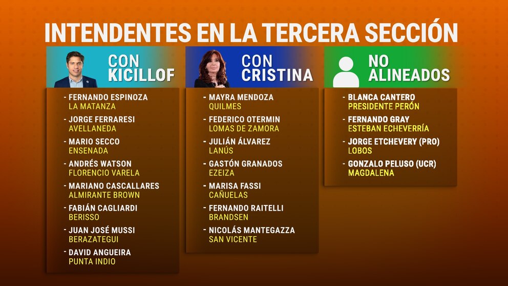 Indart identifica a varios intendentes que ya han tomado partido en esta contienda. Fernando Espinoza, de La Matanza, y Mario Secco, de Ensenada, se alistan del lado de Kicillof, mientras que Mayra Mendoza de Quilmes y Patricio Mussi de Berazategui están firmemente con Cristina. Cada uno de estos actores tiene mucho en juego debido al impacto electoral que tiene la división de votos dentro de sus respectivos territorios. “Todo está muy atado con alambre”, dijo Indart, refiriéndose a la inestabilidad de estas alianzas políticas.